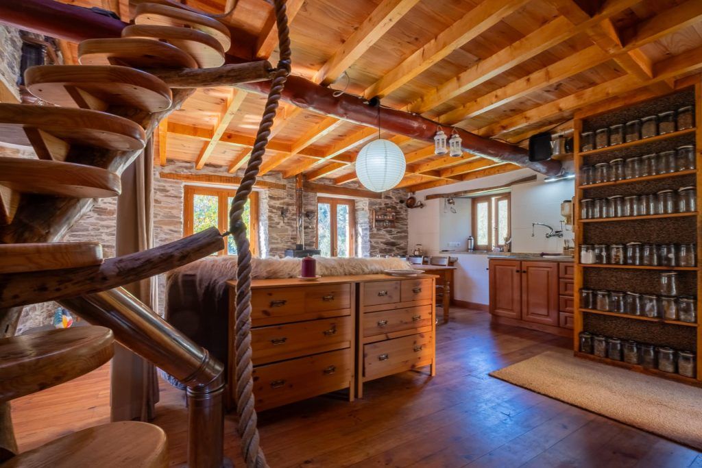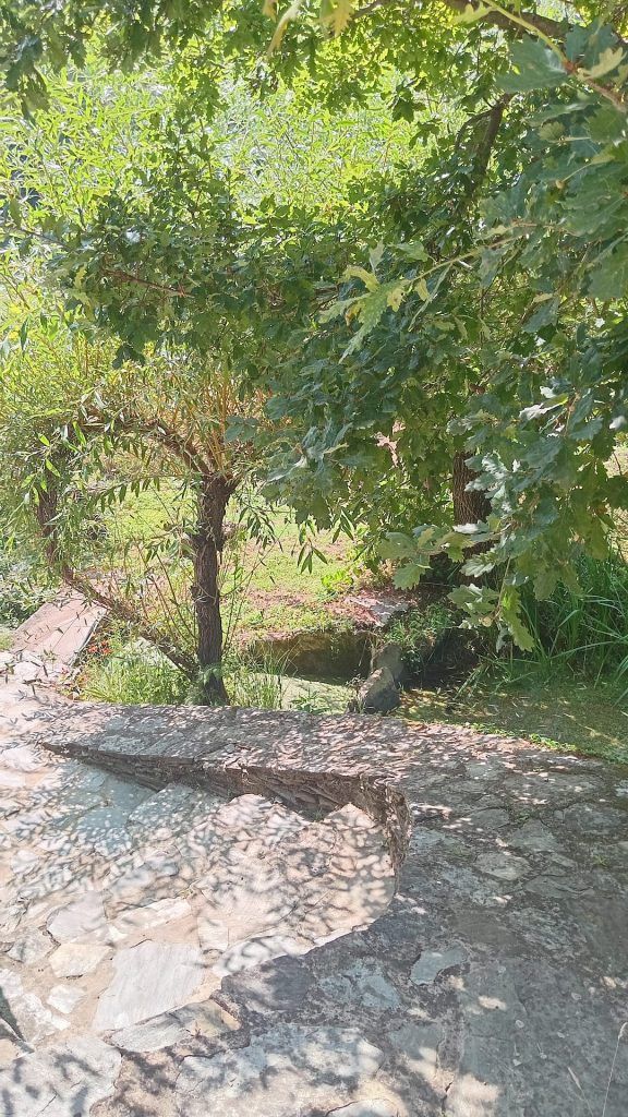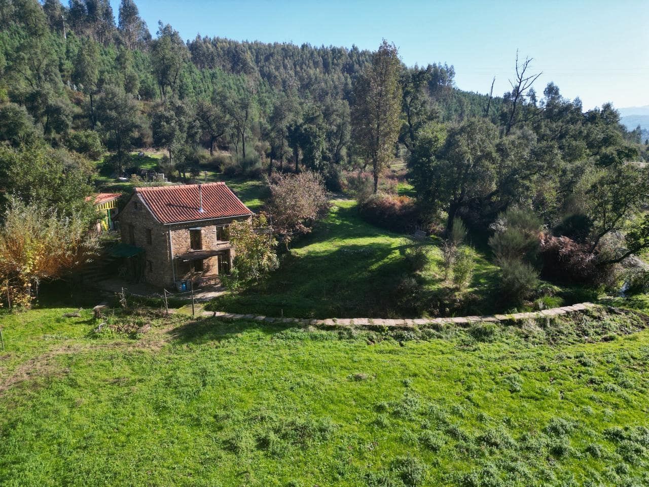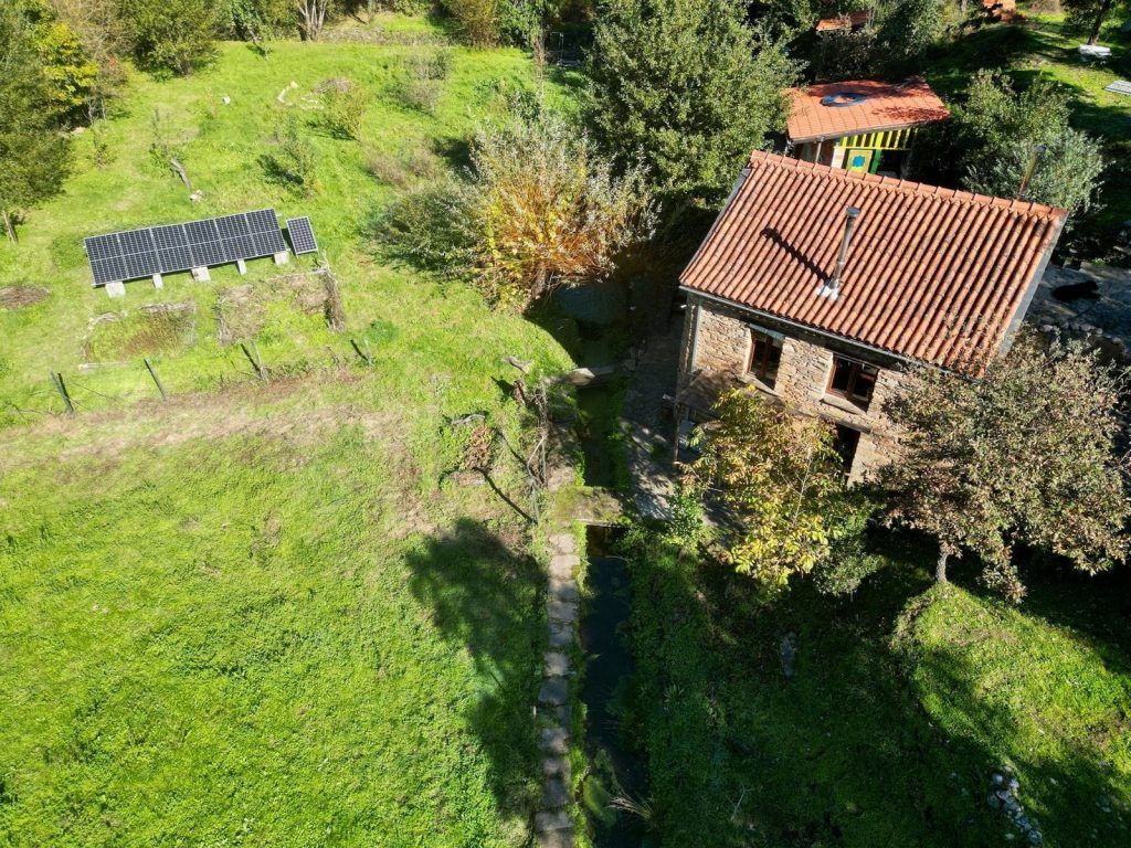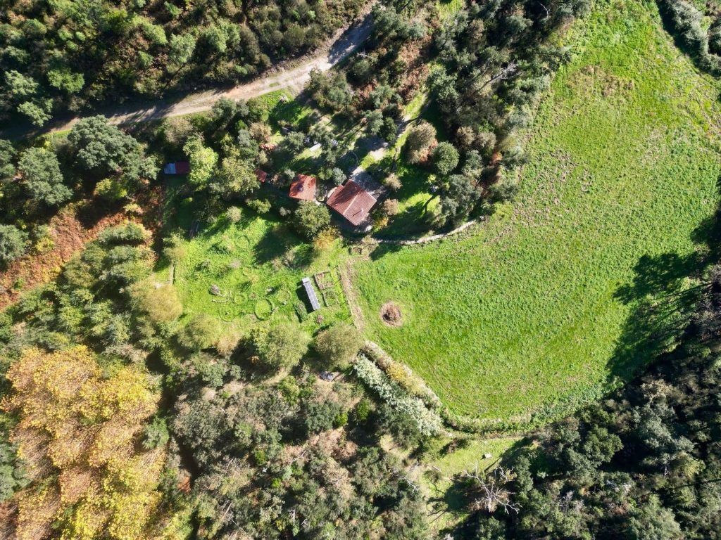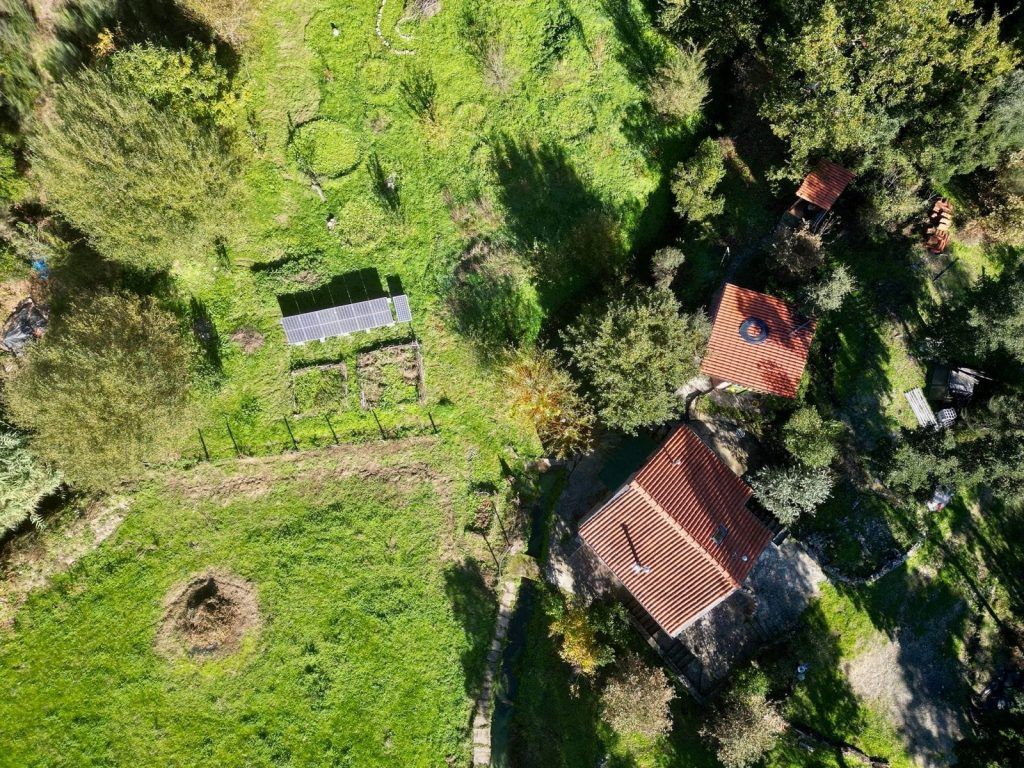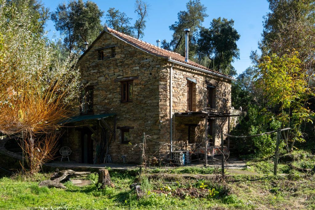 Het land is voor de helft vlak, omringd door water en aan beide kanten een berg. Op de ene staat de watertank, voldoende hoogte voor waterdruk in het huis. De andere berg is met oude leistenen muurtjes, terrassen, ideaal voor een yurt-tent-en/of yoga platform. Berg is begroeid met kurkeik, modronho, portugese eik, den en brem. De helft van het vlakke land word gebruikt als groentetuin met fruitbomen. Oude appel, kastanje, vijg en hazelnoot. Jonge pruimen, kersen, appel, diospyros, feijoa, citroen, vijg en walnoot. De andere helft is grasland. Twee verdiepingen hebben een houtkachel en een keuken. De midden verdieping heeft een klein badkamertje met een houtgestookte boiler.