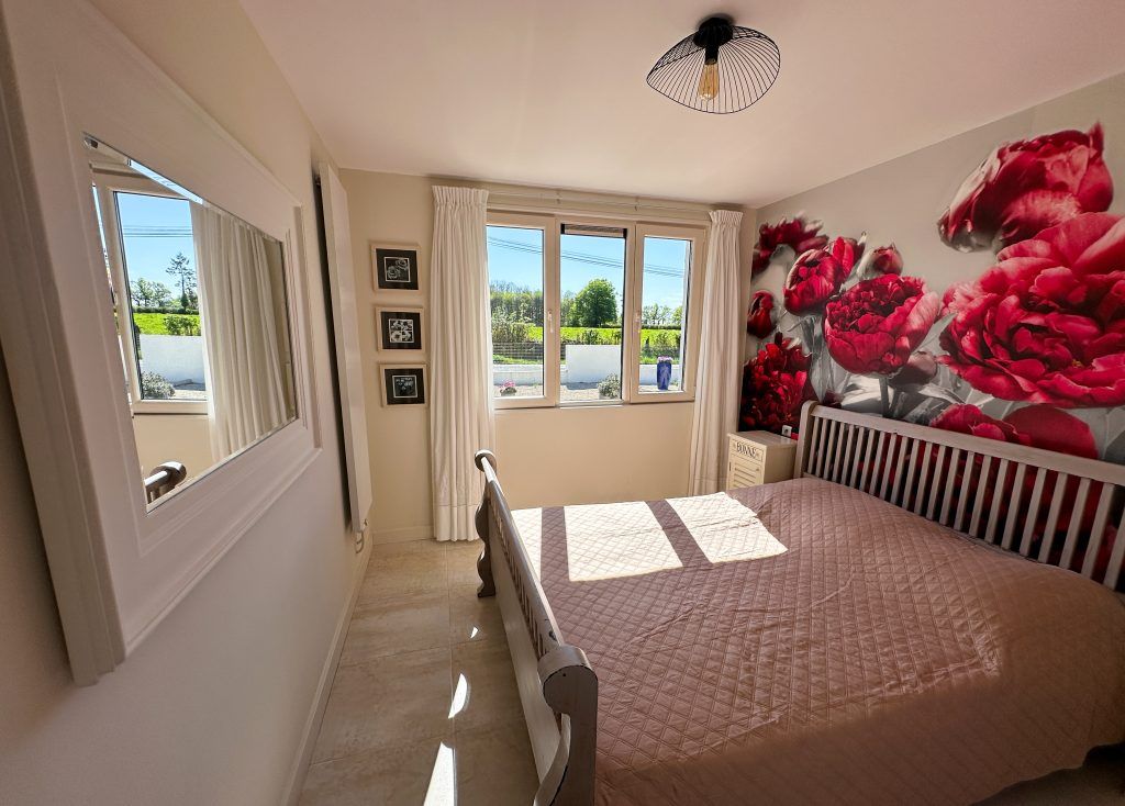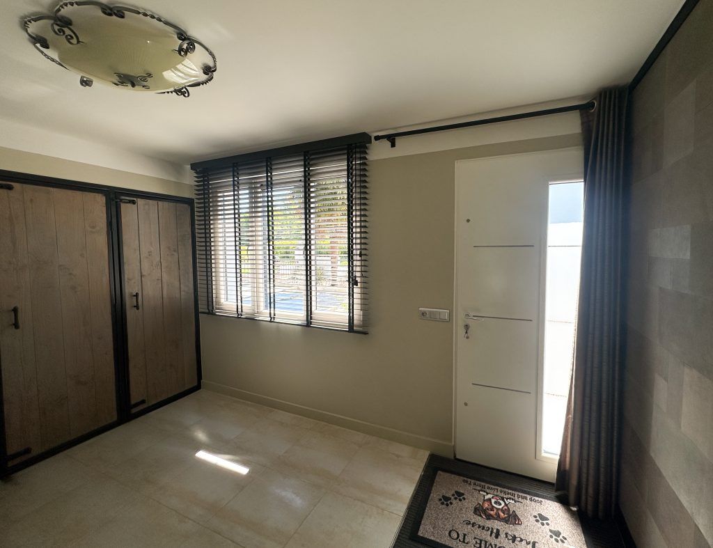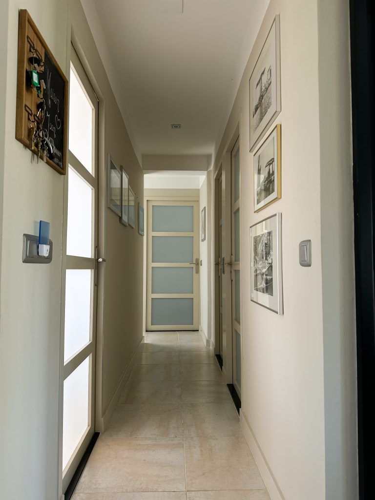 Daarnaast biedt de gang toegang tot 3 slaapkamers, wc, badkamer en via een dubbele stalen glazen deur toegang tot de woonkamer.