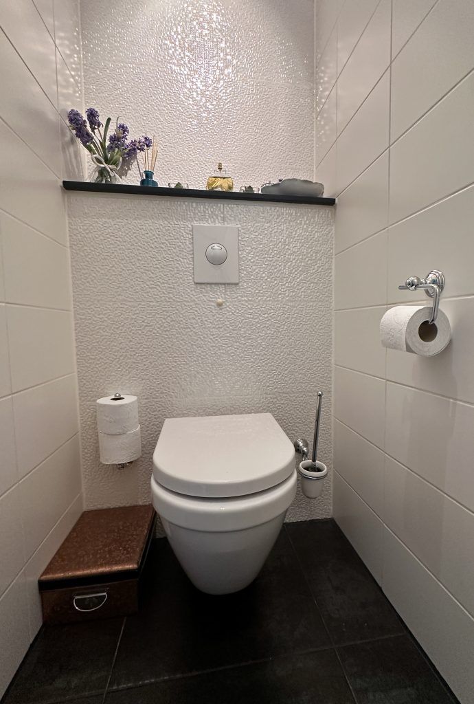 De wc (1,35 m2) heeft een plavuizenvloer en is geheel betegeld, een hangtoilet en een elektrische ventilatie.