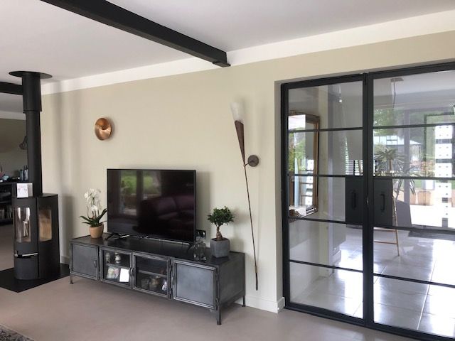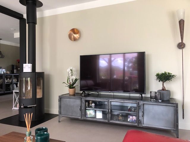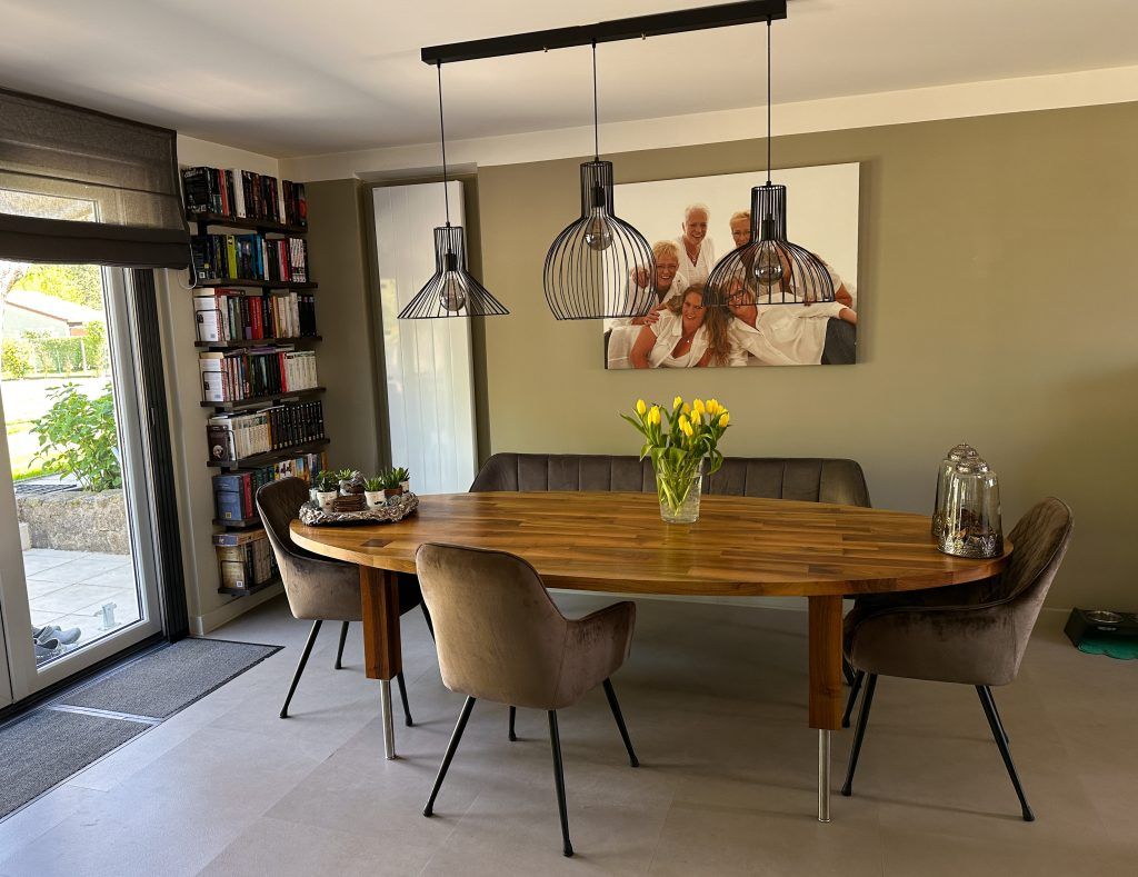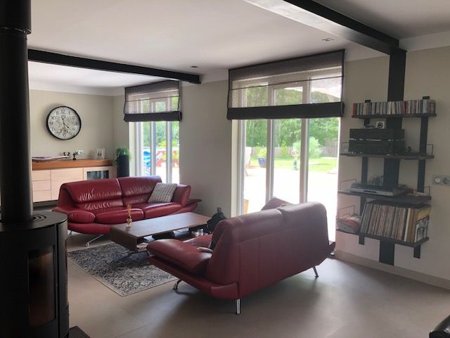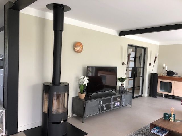 De sfeervolle open woonkamer en keuken, 55 m2, is afgewerkt met een betonlook pvc vloer en is voorzien van een houtkachel en een airco reversibel. Vanuit de woonkamer heeft u via dubbele tuindeuren, voorzien van schuif hordeuren, toegang tot het terras en de achtertuin.