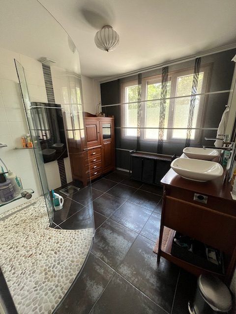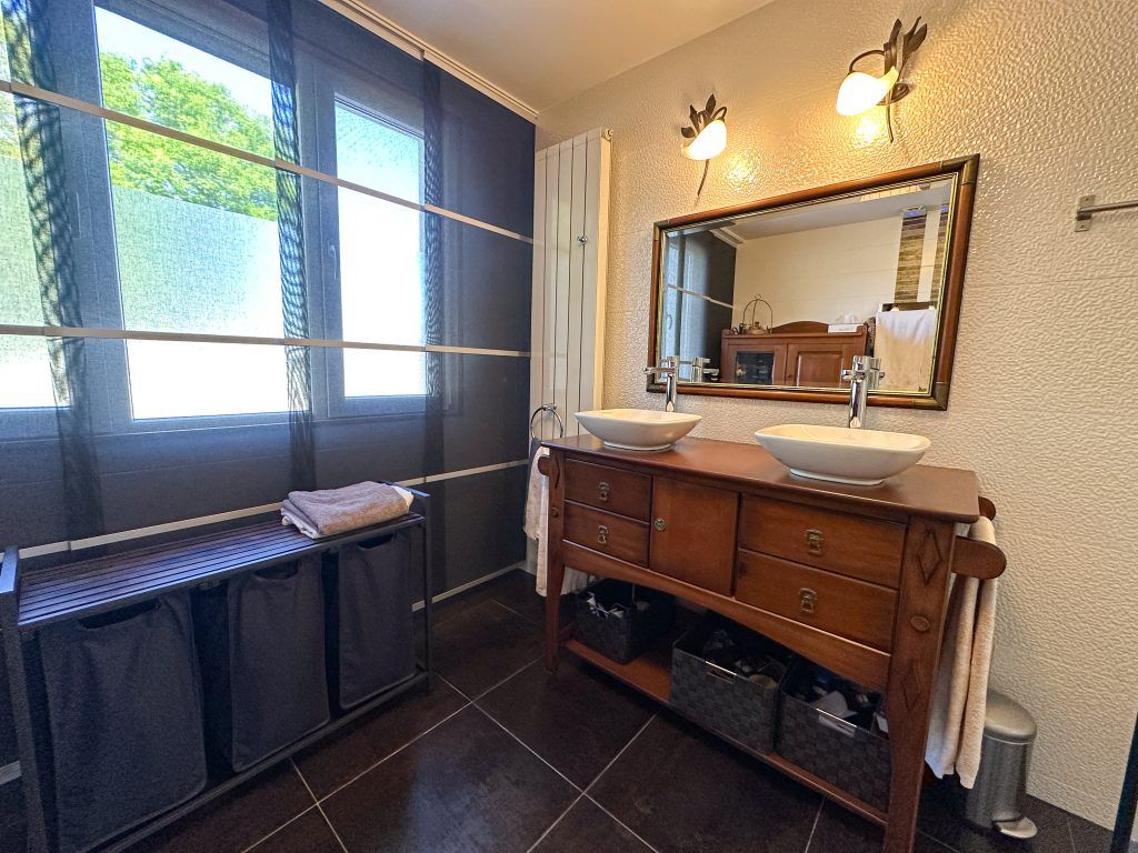 De badkamer (9 m2) is voorzien van een plavuizenvloer en is geheel betegeld, heeft een elektrische ventilatie, een badmeubel met dubbele wastafel, een grote inloopdouche met 2 halfronde glazen wanden.