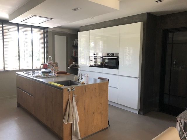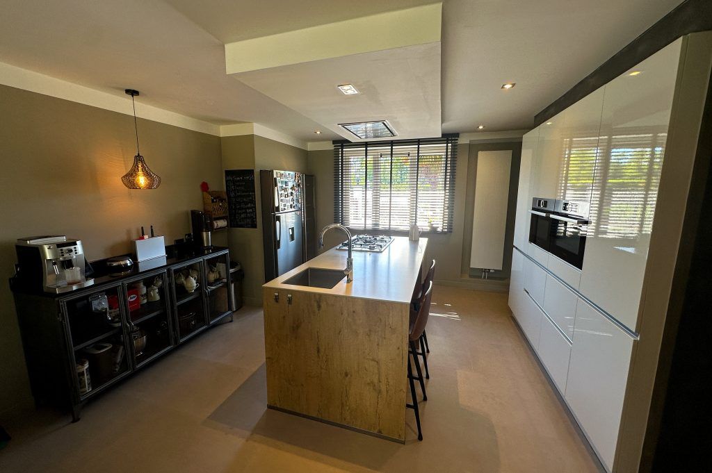De open keuken heeft een kookeiland voorzien van een composietblad, een 5 pits gasplaat, spoelbak, Quoker, afwasmachine en een rvs plafond afzuigkap. Daarnaast bevind zich in de keuken een koelvriescombinatie en een wijnkoeler (optie). Een 4- deurs ingebouwde kastenwand met een oven en een combi-oven.