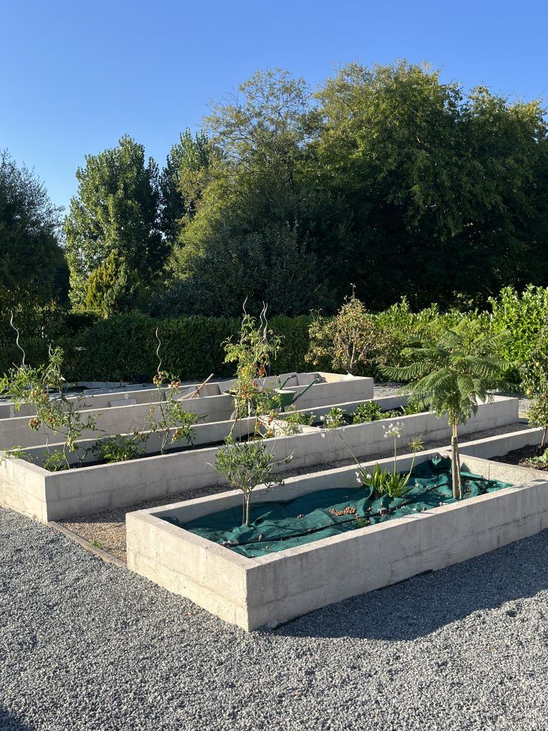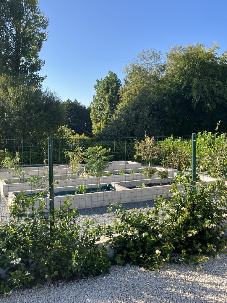 De voortuin heeft een vrij uitzicht over de landerijen en bestaat uit 2 gedeeltes. Een gedeelte bestaat uit beplanting en split. Het tweede gedeelte heeft betonnen bakken om als moestuin te gebruiken en fruitboompjes ook grotendeels voorzien van split.