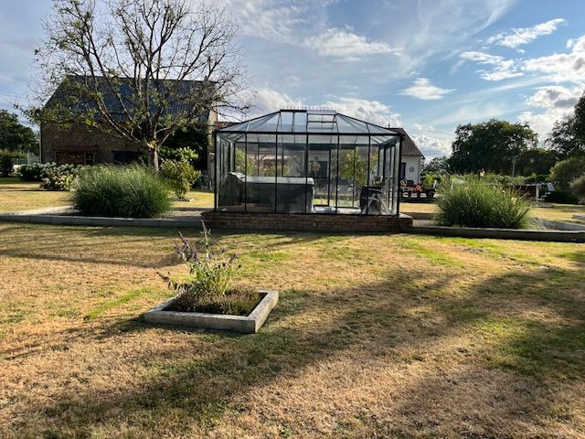 De ruime achtertuin heeft een groot plavuizen terras met aansluitend een houten terras. Gazon en vaste planten verspreid door de gehele tuin. In het midden van de tuin staat een oranjerie.