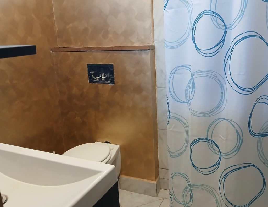 Tussen het woonhuis en de schuur is al een nette, overdekte constructie gemaakt. Hier vind je een grote, betegelde te renoveren badkamer, een buitenkeuken en diverse afgesloten bergruimtes – ideaal voor zomerse dagen en buitenleven. De mogelijkheid om dit overdekte geheel bij het woonhuis te betrekken is voorbereid.
