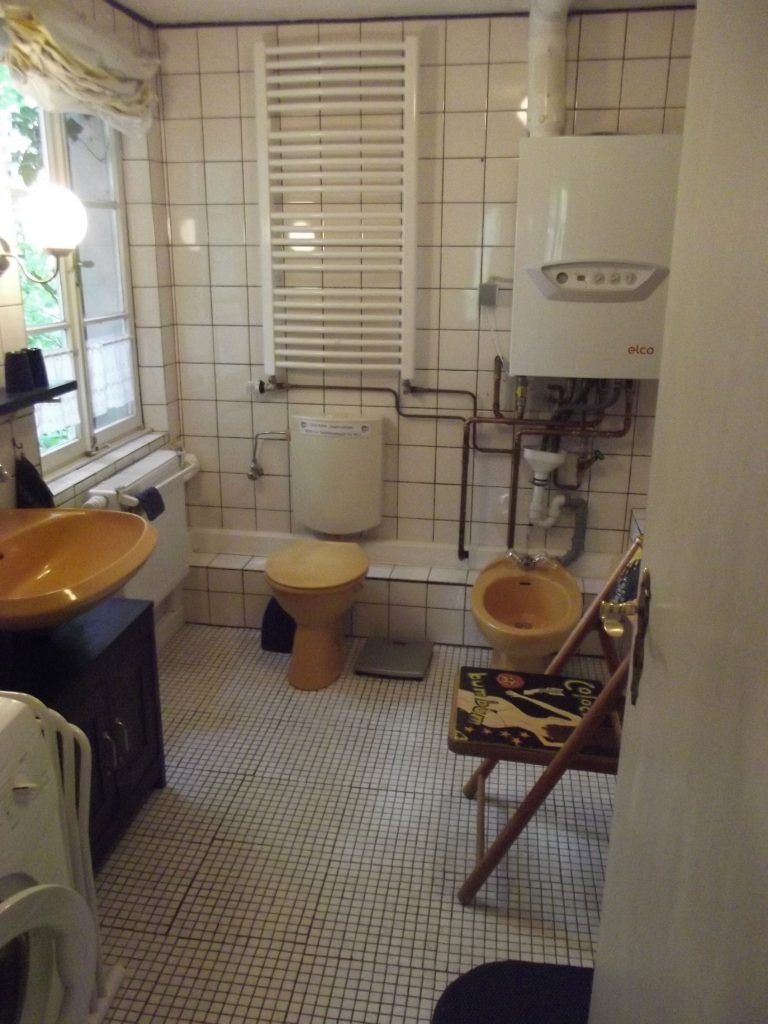 - Badkamer met ligbad, bidet, douchecabine en wasmachine