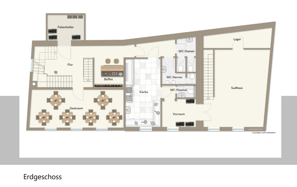 De brouwerij ligt direct aan de populaire Ruhrtalradweg en profiteert daardoor van een constante stroom aan bezoekers. Dankzij de helling beschikt de bovenverdieping tevens over een extra gelijkvloerse toegang via de Jägerstraße.