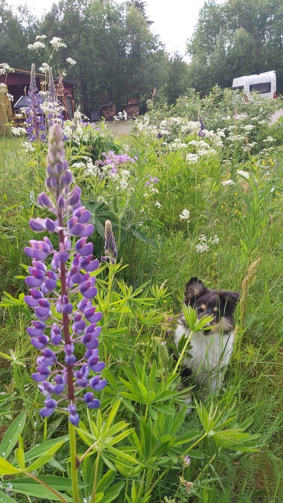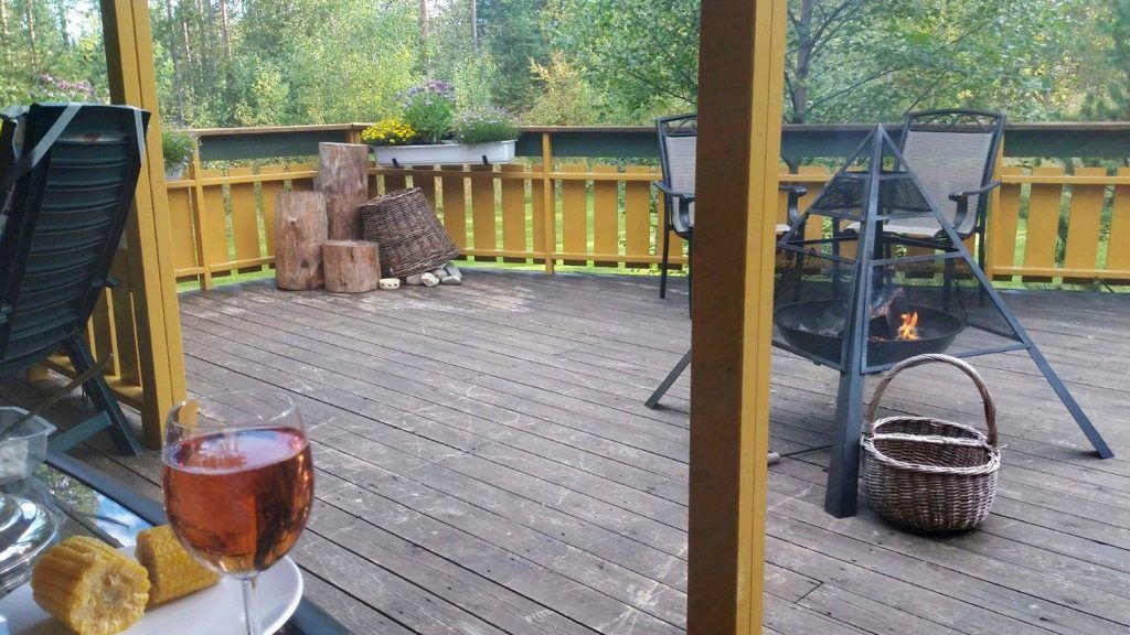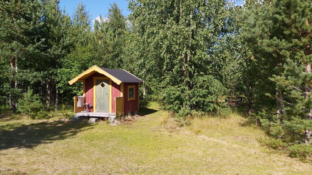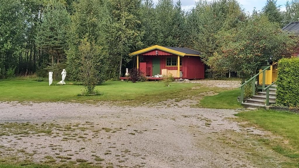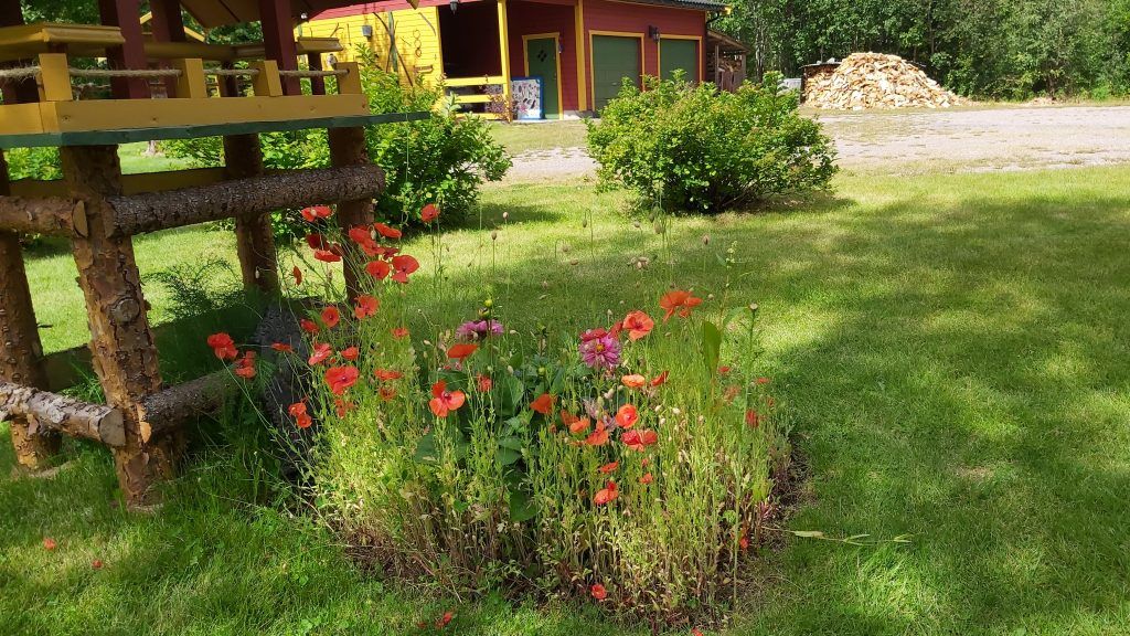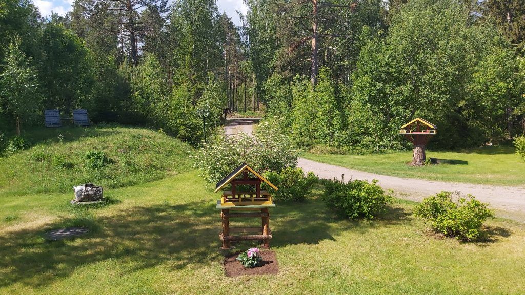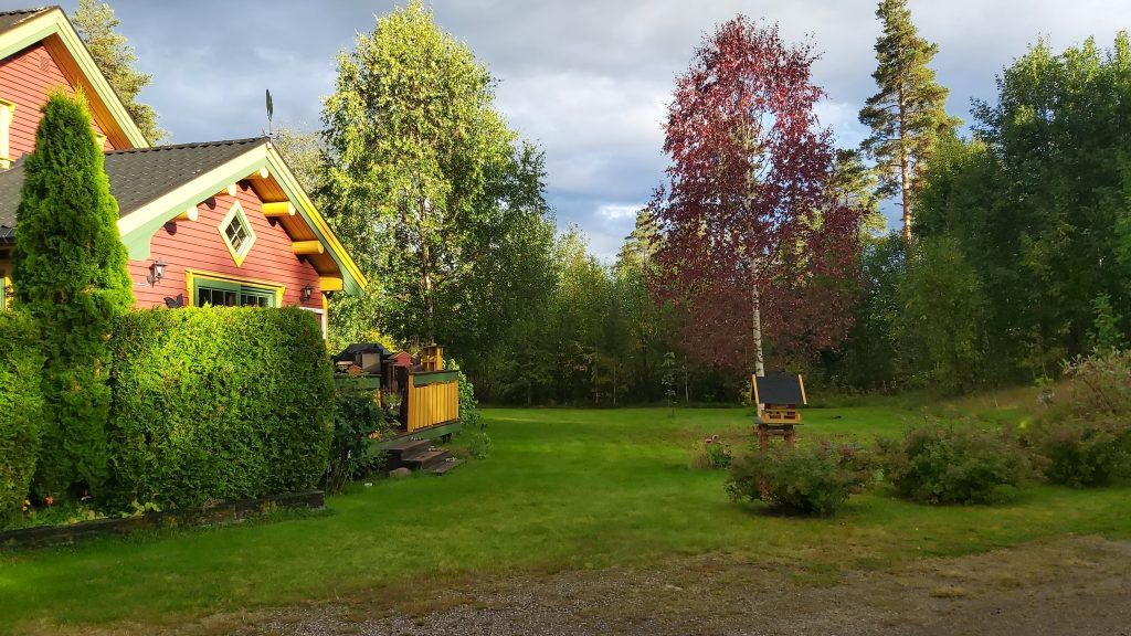 De buitenruimte bestaat uit diverse grasvelden met o.a. een zwarte bessenstruik en een kersenboom. Achter het huis hebben we een park gecreëerd met diverse wandelpaden en een vuurplaats: een oase van rust in een prachtige natuur! Bezoek van elanden of reeën is overigens niet ongewoon, om maar van de vele vogels en eekhoorns te zwijgen! Het grootste deel van het terrein van ca. 39.000 m² bestaat uit bos: dennenbomen, sparrenbomen en berkenbomen. In het bos zijn vele cranberry- en bosbessenstruiken te vinden; genoeg om jaarlijks vele potten jam van te maken! Ook loopt er een klein beekje over het terrein. In een aantal oude bomen zijn eigendomsmerken in de bast gekerfd; op die manier gaf men in vroegere tijden de grens van het eigendom aan. Mocht de boom dood gaan, werd er een paaltje neergezet.