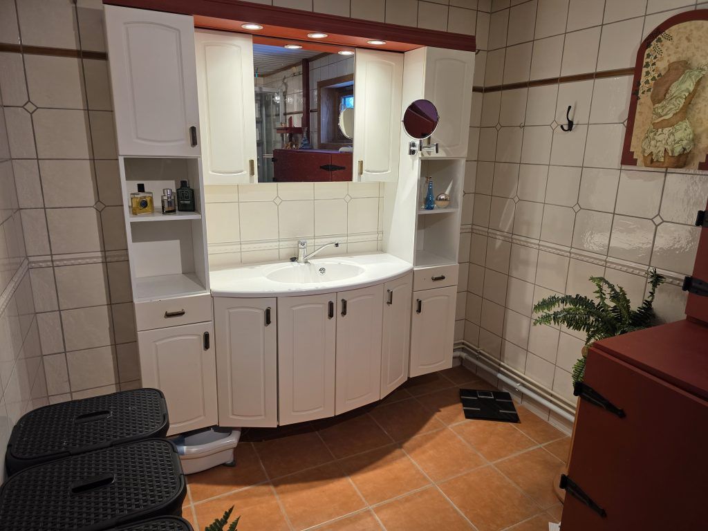 ·        Het badkamermeubel en de wastafel zijn gedateerd. Alles fungeert desalniettemin nog prima.