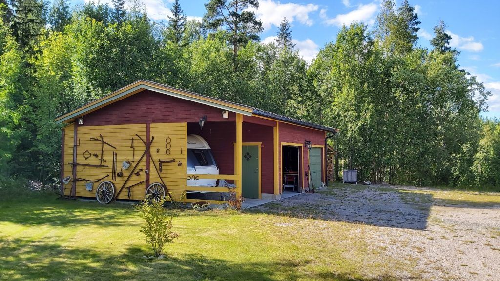 Op het terrein bevindt zich een dubbele garage met carport (inclusief oplaadpunt voor een elektrische auto), een ‘hytte’ uit ca. 1980 (momenteel in gebruik als atelier, maar ook geschikt als gastenverblijf of kantoor) en een speelhuisje (momenteel in gebruik als opslag voor tuinmeubelen). Verder is er naast de garage een dubbele houtopslag gebouwd; het hout – en tevens het hout in de op het terrein staande korven – is bij de verkoop inbegrepen.