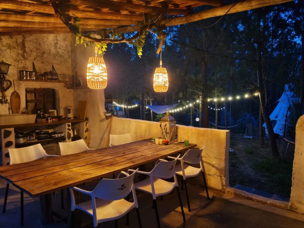 De buitenkeuken 'Praça da Vida' met BBQ, wasgedeelte en zitplek dient als gedeelde ruimte voor campinggasten. Een houten badhuisje met douche en toilet completeert de faciliteiten.