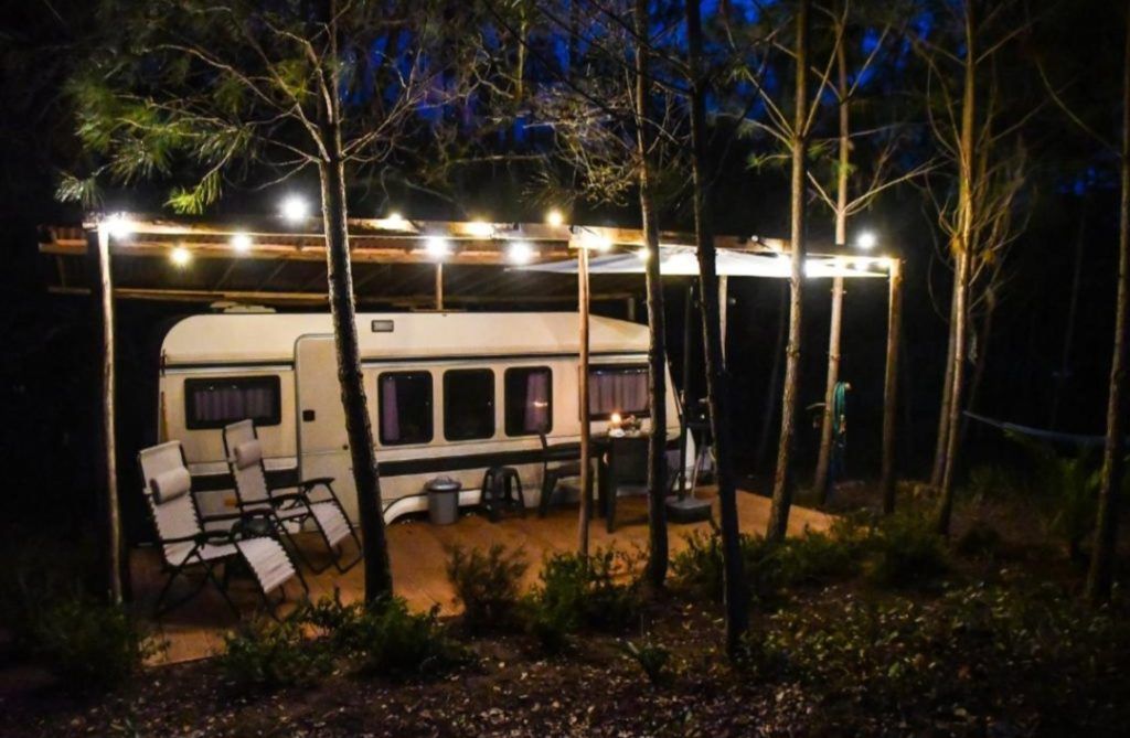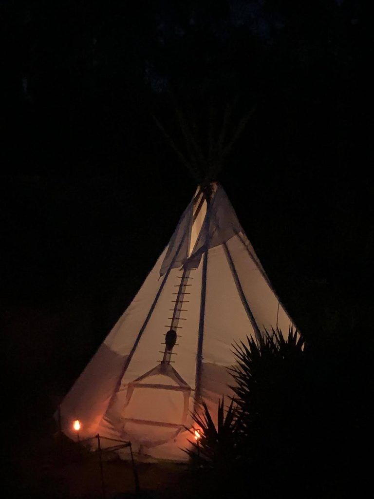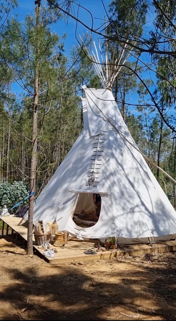 Tipi Tent Lobo — 36 m² vlonder met ø5,5 m tipi (optioneel over te nemen) Caravan Baleia — 18 m² vlonder met overkapping (optioneel over te nemen) Derde standplaats — volledig aangesloten voor camper, caravan of tent