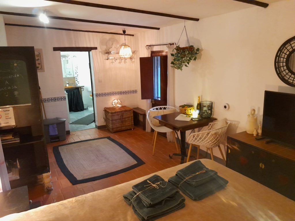 Casa Galo (±45 m²) — Woonkamer met slaapbank, separate slaapkamer, eigen badkamer, keuken en privéterras. Geschikt voor maximaal 4 personen.